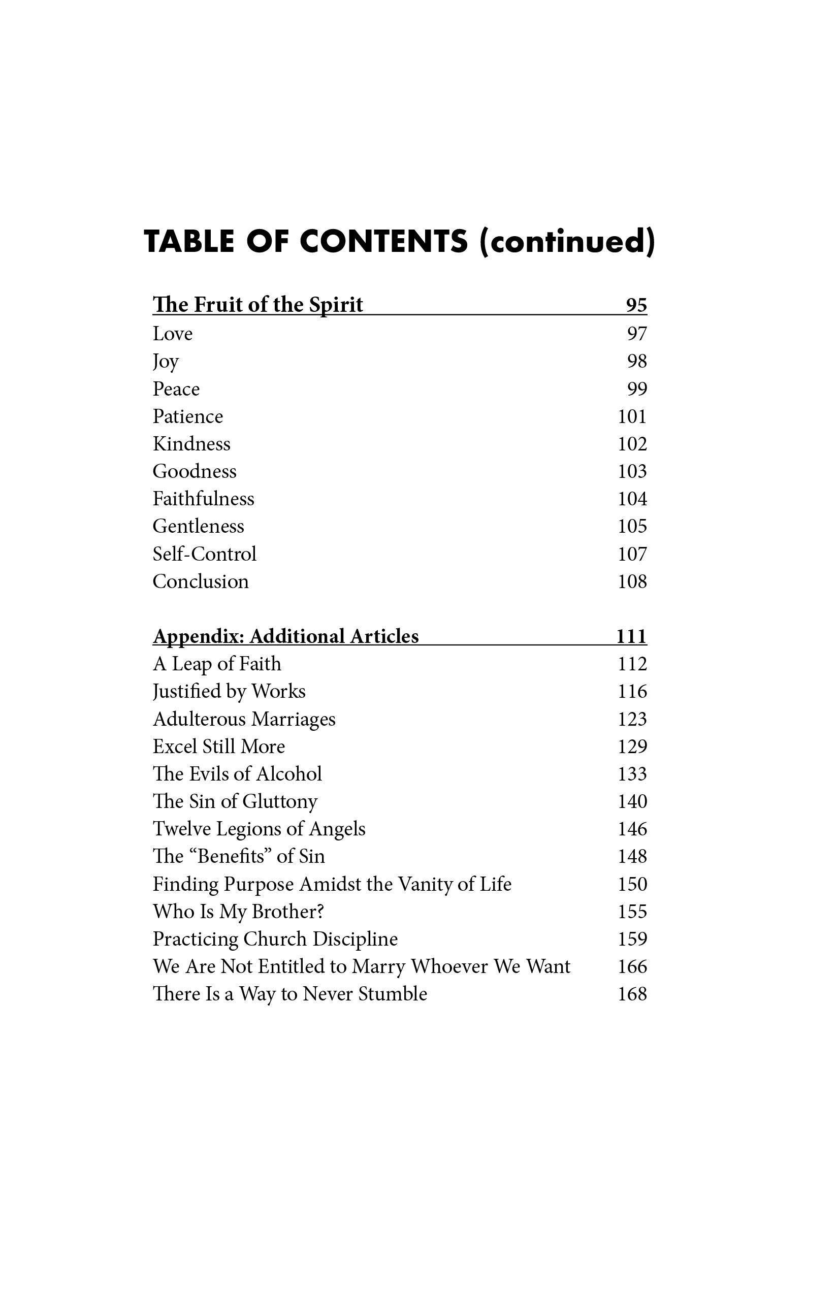 The remainder of the book provides supplemental material that reinforces this theme. A section on The Importance of Faith explains why faith is essential, while The Fruit of the Spirit examines the qualities produced by following the guidance of the Holy Spirit as revealed in the word of God. An appendix of thirteen additional articles explores several of these topics in greater depth.