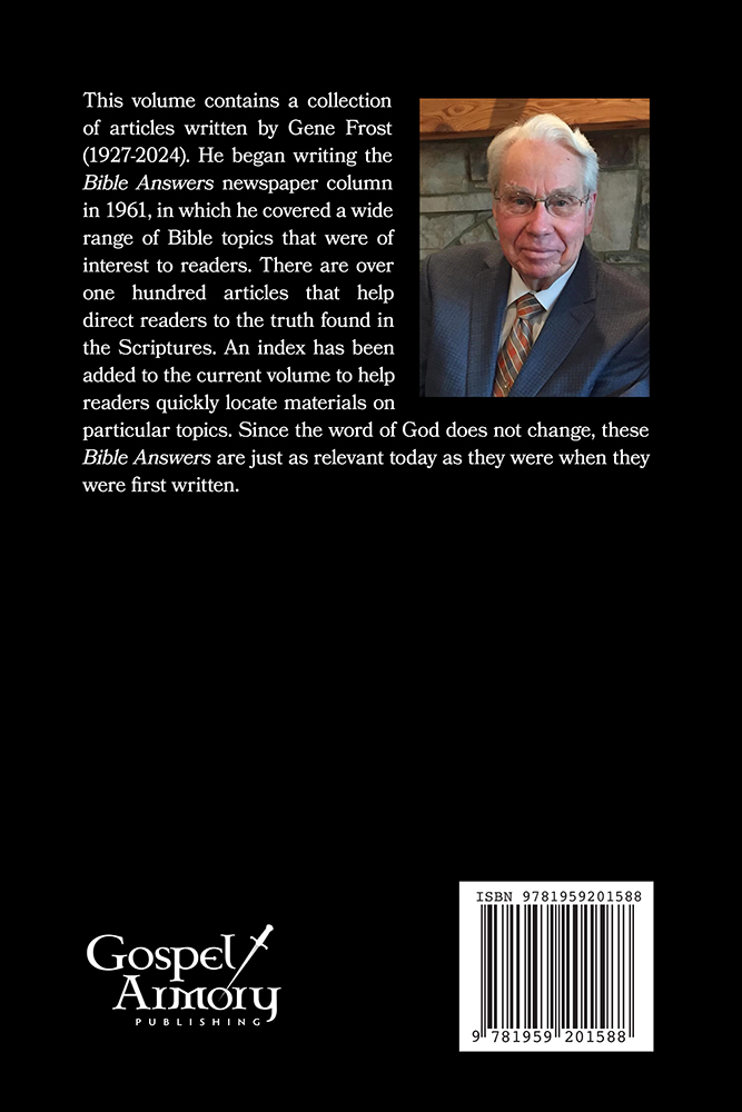 This volume contains a collection of articles written by Gene Frost (1927-2024). He began writing the Bible Answers newspaper column in 1961, in which he covered a wide range of Bible topics that were of interest to readers. There are over one hundred articles that help direct readers to the truth found in the Scriptures. An index has been added to the current volume to help readers quickly locate materials on particular topics. Since the word of God does not change, these Bible Answers are just as relevant today as they were when they were first written.
